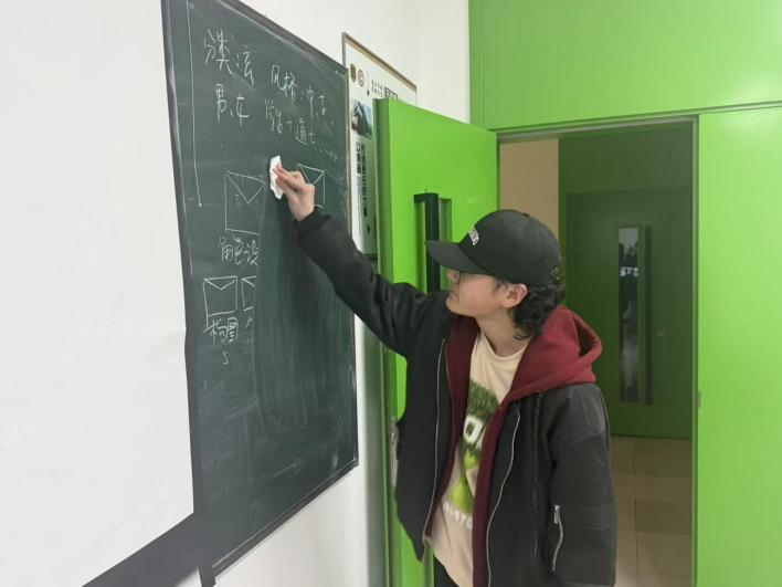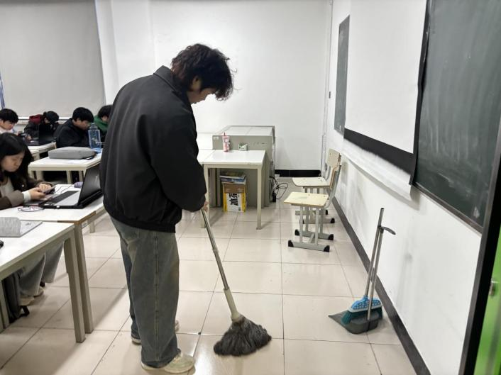 在正式清扫过程中,志愿者们分工协作、默契配合,充分展现出青年学子的责任与担当。大家手持清洁工具,对教室内外进行全面清理:认真擦拭黑板,仔细清扫地面纸屑、铅笔屑与颜料残留,整理摆放桌椅,清理卫生死角,同时对讲台周边、窗台等容易忽略的区域进行重点清洁。面对顽固污渍,同学们耐心处理、反复擦拭,不放过任何一处细节,用汗水换来教室的整洁明亮。