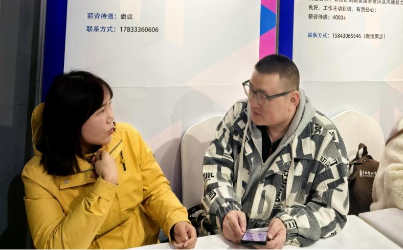 招聘会现场,漫画学院党总支书记刘轩如带着学工办和漫画学子一行穿梭于各大招聘企业之间,与企业负责人亲切交谈。