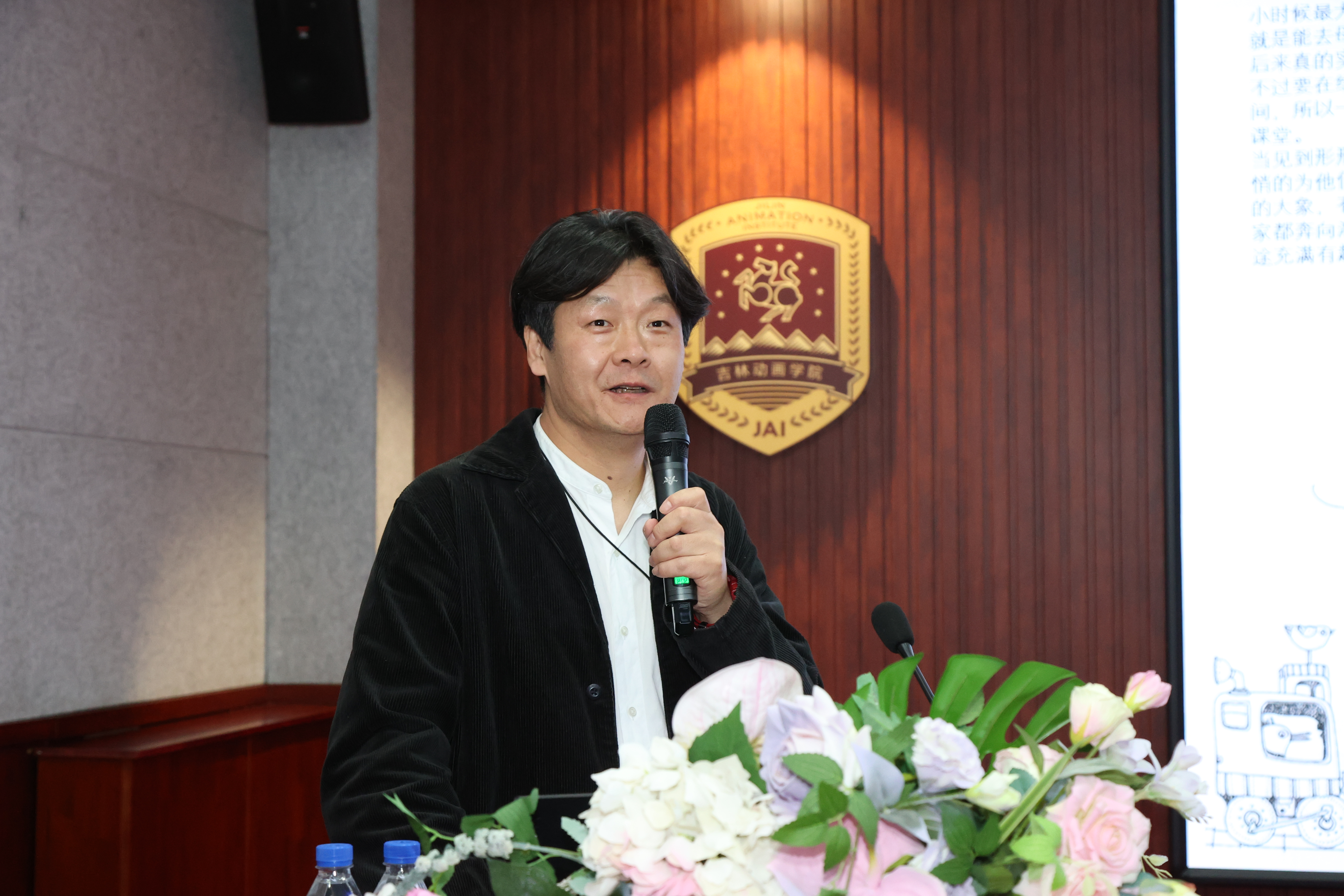 会议伊始,主持人对到场师生表示欢迎,并隆重介绍了主讲人聂峻先生。聂峻先生是中国著名青年文化家、绘本作家,毕业于中国美术学院,曾获中国文化艺术政府奖最佳漫画奖,是北京奥运会福娃吉祥物设计一组成员,其作品在多国出版并多次获奖,代表作《老街的童话》入选第十三届全国美展获奖提名等多项荣誉。同时,漫画学院副院长李吉品教授代表全学院对聂峻先生的到来表示诚挚感谢,并表达了对漫画创作平台及专业选择的感恩之情,期待聂峻先生与同学们分享创作经验。