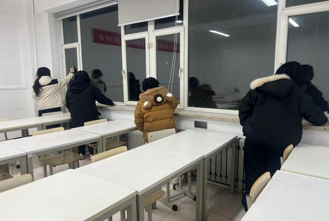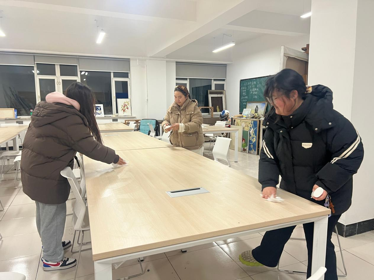 活动前,学院辅导员孟益欣提前部署分工,明确劳动范围与安全注意事项。同学们以班级为单位,携带扫帚、拖把、抹布等清洁工具,有序进入各自负责的教室区域。劳动过程中,大家分工协作、干劲十足:有的同学专注擦拭多媒体设备和黑板,细致清理缝隙中的粉笔灰;有的同学弯腰清扫地面,对桌下、墙角等卫生死角进行彻底打扫;还有的同学负责整理课桌椅、归置教学用具。