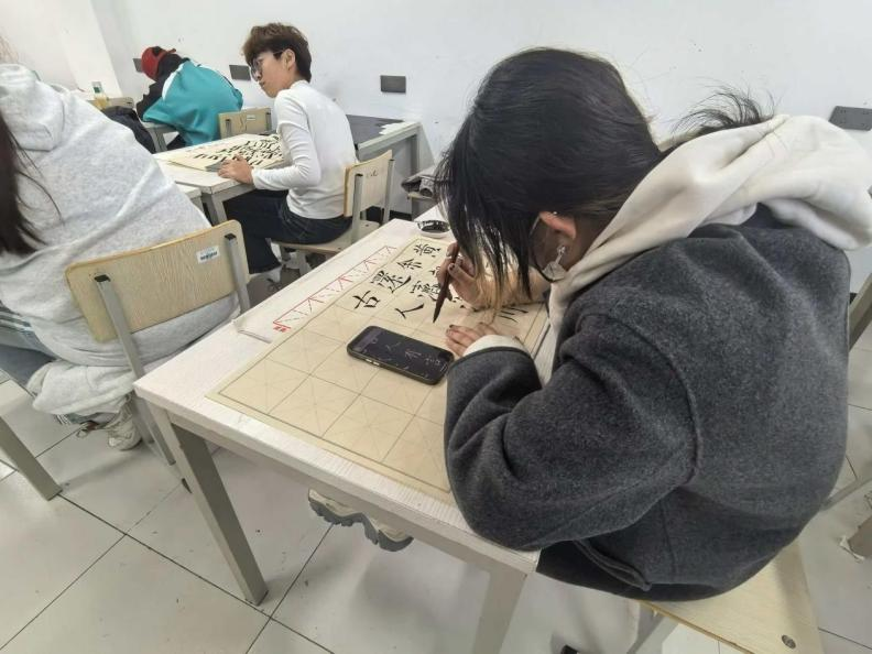 随后,社员们开始分组进行练习。大家铺展宣纸、研磨蘸墨,凝神静气地书写起来。有的社员专注练习楷书临摹,一笔一划力求工整规范;有的社员尝试行书创作,追求线条的流畅与灵动。活动过程中,社员们分工协作、互助学习,经验丰富的老社员主动为新社员讲解书写技巧,现场学习氛围十分热烈。